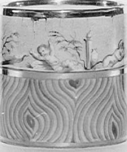 tazza "à litron" con ansadipinta di giallo con striature a finto legno sulla parte inferiore e putti a monocromo nella parte superiore. Bordi dorati