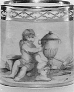 Tazzina cilindrica con ansa. Porcellana bianca, dipinta di giallo con bordi oro con motivo a graticcio. Sulla tazzina, una serie di putti a monocromo che compongono l'allegoria della scultura.