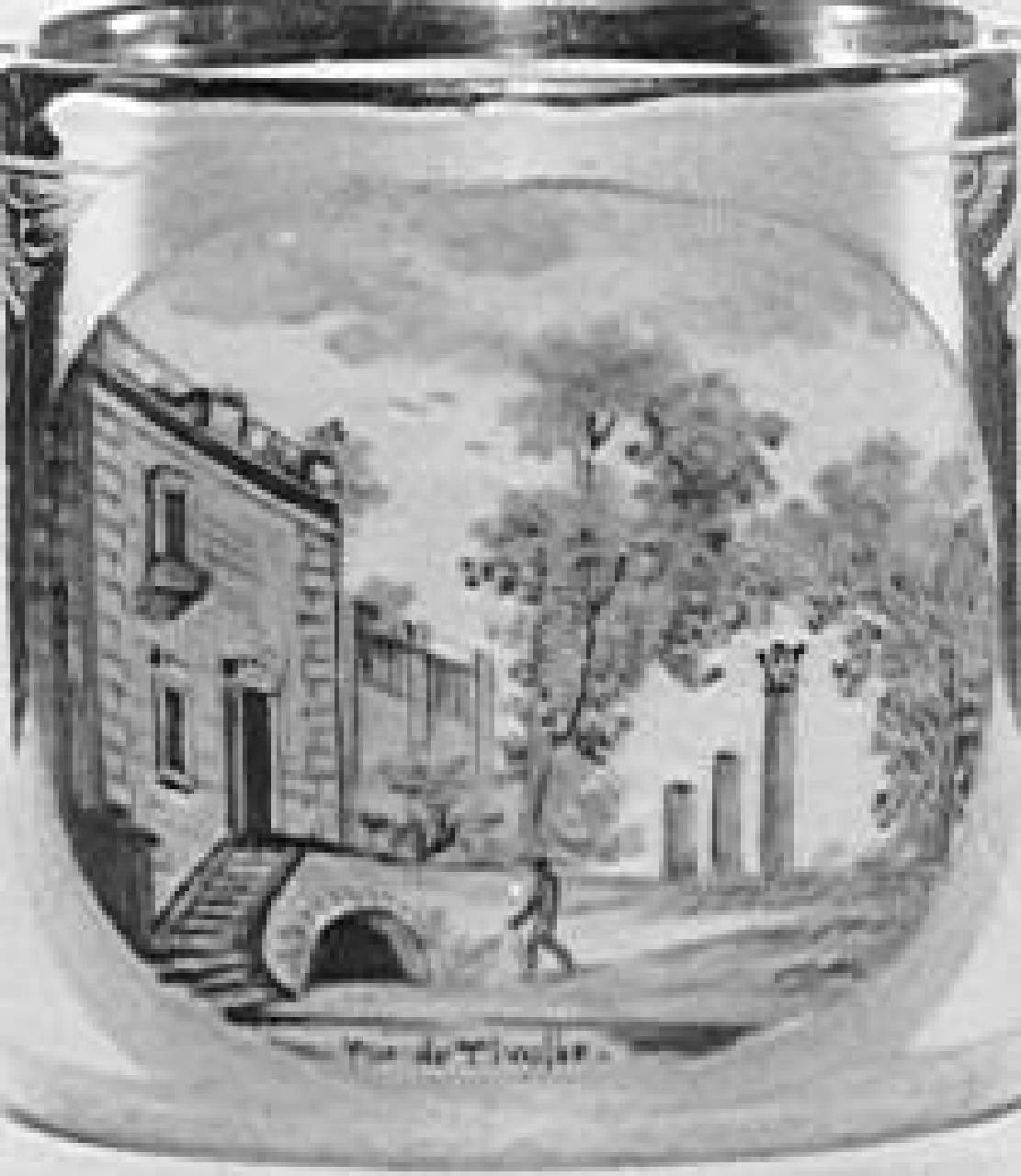 Tazza cilindrica tronco-conica, ornati oro: paesaggio con veduta di palazzotto antico e alberi ("Vue de Tivoli").