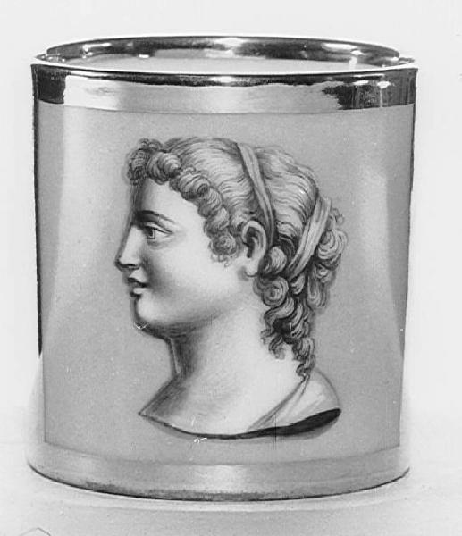 - NOTIZIE STORICO CRITICHE Tre tazze decorate con motivi simili (profili a monocromo, o a colori, H 94, H 95, H 96) sono state ricondotte alla stessa manifattura per ragioni stilistiche; si tratta di un gusto che ben si inquadra nella produzione nota come "Porcellana di Parigi" e suggerisce l'acquisto presso manifatture nella capitale. \nM. Albertario