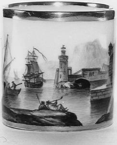 Tazzina cilindrica con ansa. Sulla tazza, raffigurazione di paesaggio con porto fortificato e navi, a monocromo