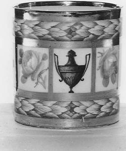 Tazza à litron decorata a fasce di alloro a monocromo alternate a fasce divise in riquadri contenenti urne e rose