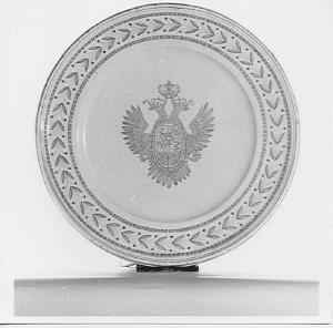 - NOTIZIE STORICO CRITICHE Lo stemma venne utilizzato a partire dal 1815, ovvero dalla fondazione del Regno Lombardo-Veneto ad opera dell'Imperatore Francesco Giuseppe Carlo Giovanni d'Asburgo-Lorena (Francesco II come Imperatore del Sacro Romano Impero e Francesco I dal 1804 come Imperatore d'Austria). Per l'iconografia dello stemma, cfr. anche scheda Sirbec di G. Virgilio: SIRBeC (SRL - G1050-00819 relativa a una stampa conservata presso i Musei Civici di Lecco).\nLa data apposta sul piatto indica che questo è stato realizzato dopo la morte dei Antonio Ferretti (1810), figlio di Simpliciano, fondatore della manifattura, negli anni in cui la fabbrica risulta custodita dal Canonico Simpliciano Poli e dal suo successore Lorenzo Crociolani.\nProbabilmente l'occasione della realizzazione del piatto fu il viaggio di Francesco I in Lombardia nell'inverno 1816 (Don Gino Angelico Scalzi, Il conte Luigi e l'Accademia Tadini, in Antonio Canova nelle collezioni dell'Accademia Tadini, a cura di M. Albertario, Milano 2010, pp. 35-61: 40), quando il conte Luigi Tadini ottenne il privilegio della visita dell'imperatore presso il suo palazzo di Crema (11 gennaio 1816). Il piatto è quindi da considerarsi come un oggetto commemorativo di quell'evento così come un'altra opera della collezione Tadini: il Busto di Francesco I realizzato da Gaetano Muttoni realizzato nel 1816 (cfr. Scheda Sirbec di S. Trichies, OARL - S0100-00163).\nIlaria De Palma