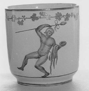 - NOTIZIE STORICO CRITICHE Le due tazzine documentano un decoro con figure di "acrobati", noti anche attraverso altri pezzi da un servizio da tè (tre tazze, la zuccheriera e quattro piattini) conservati a Milano, presso il Museo Teatrale alla Scala (Lise 1975, p. 244 n. 604). La circolazione dei motivi è documentata anche dalle incisioni del Voyage (1782). \nLa presenza della marca "FRF", con riferimento alla Real Fabbrica Ferdinandea, consente di datare i pezzi al primo periodo della gestione di Domenico Venuti, che impresse alla produzione napoletana un raffinato gusto "all'antica": la serie si data infatti agli anni 1773-1787, con una preferenza per quest'ultimo termine (A. Mottola Molfino 1977, figg. 278-279 data i pezzi al 1785 ca.). Dal punto di vista tecnico, i quattro pezzi loveresi documentano quella fase della produzione della Real Fabbrica nell'ambito della quale l'uso di una particolare miscela di caolino e feldspati e un particolare gusto "all'antica" rendevano necessario il ricorso a una campitura di base in bianco, che costituiva una stesura perfettamente smaltata sulla quale il colore era steso a puntini, con raffinata tecnica da miniatore (A. Carola Perrotti, 1978).\nM. Albertario