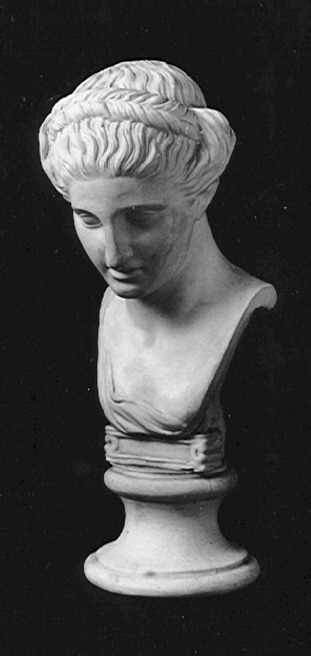 Busto femminile con capelli disposti a treccia in forma di corona attorno alla fronte, su base circolare