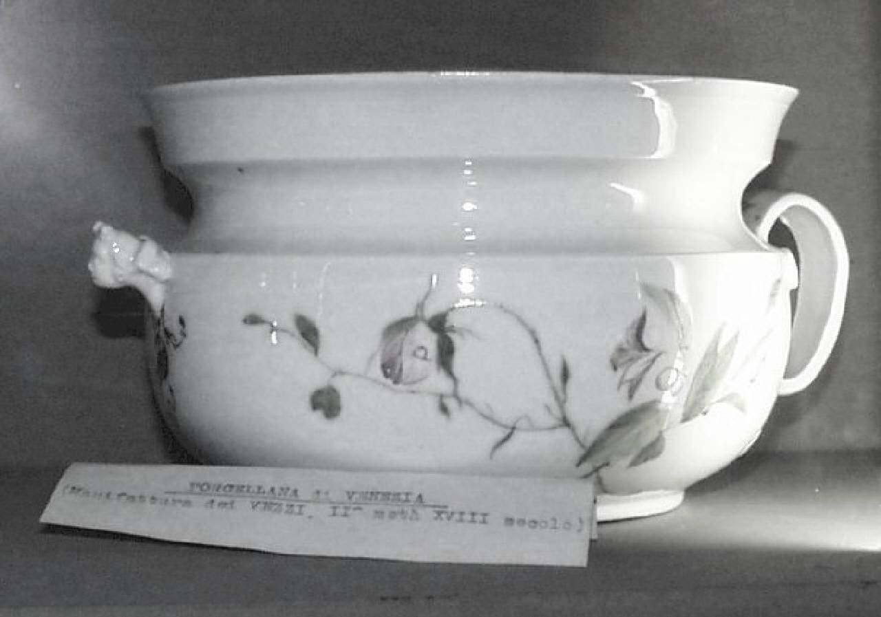 - NOTIZIE STORICO CRITICHE Il motivo decorativo con la farfalla e lo stile della decorazione policroma dell'interno del vaso, eseguita con tratto svelto, permette di avvicinare l'esemplare in esame alla terrina con decoro floreale pubblicata da Melegati (1998, p. 64, n. 8) e datata post 1727, quindi dopo la distruzione dei forni ad opera di Giovanni Vezzi.\nNel medesimo catalogo, tuttavia Melegati data post 1740 la decorazione di una teiera con fiori rosa e rami verdi (1998, p. 98, n. 24), molto simile ma meno accurata rispetto a quella presente sulle pareti esterne del vaso da notte della collezioen Tadini. E' possibile infatti quest'ultimo sia uno dei numerosi casi di "bianchi" realizzati dalla manifattura Vezzi e decorati in occasione delle ultime vendite di porcellana della fabbrica di cui rimangono tracce documentarie fino agli anni Quaranta del del XVIII secolo.\nIlaria De Palma