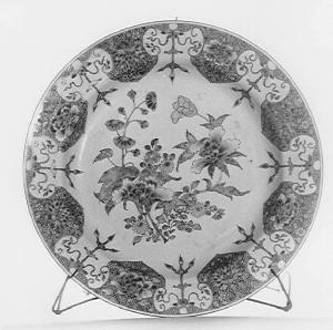 Grande piatto in porcellana con decorazione a smalti nella paletta della famiglia rosa realizzati sopra coperta, marrone, blu, rosa, giallo, verde chiaro, smeraldo e bianco. Sul fondo sono raffigurati peonia, aster e malva e la tesa è interessata da una bordura con fondo marrone a finissimi girali con riserve modanate dalle quali ricadono pendenti con nodi benaugurali, nappe e pietre sonore