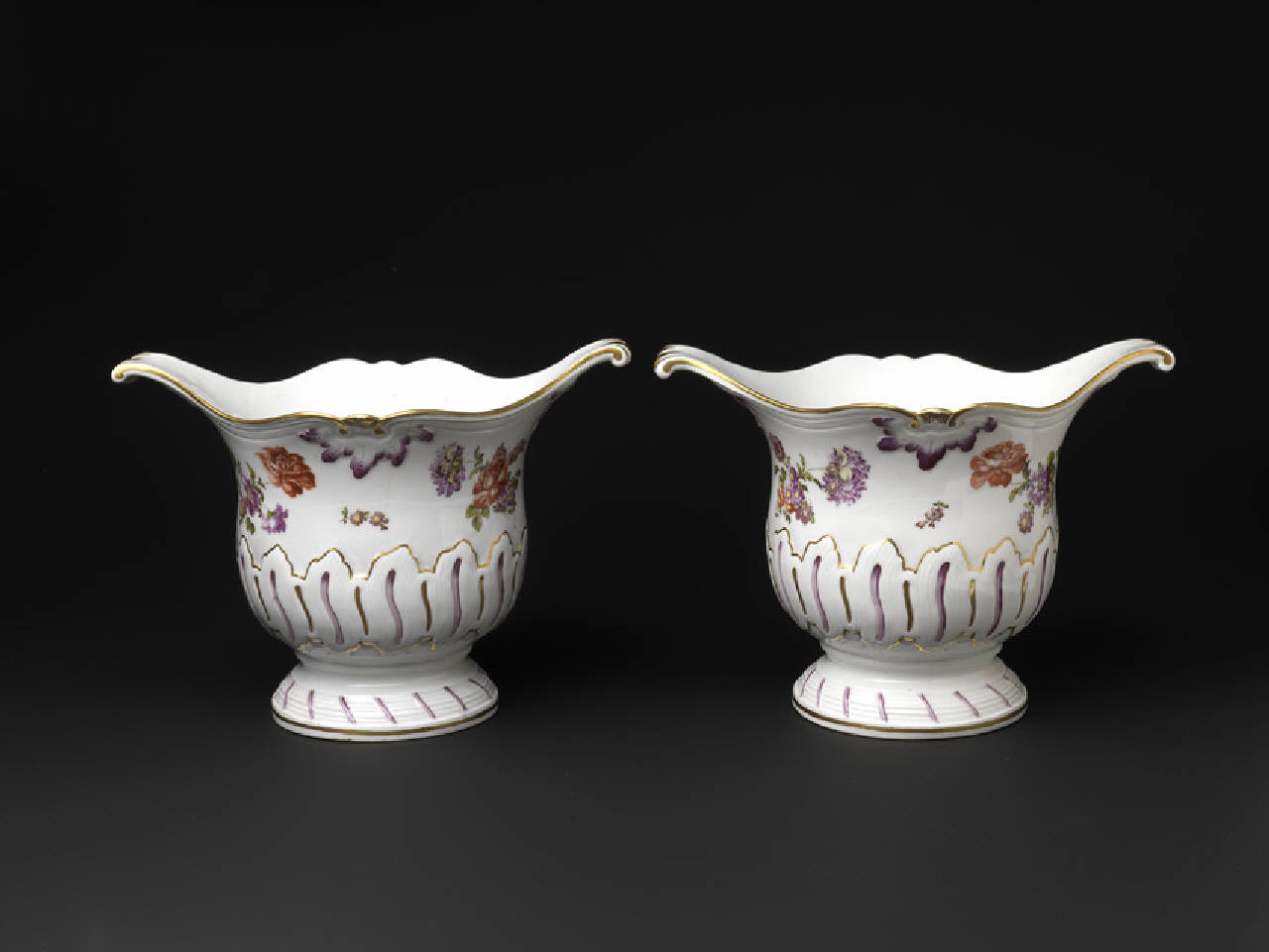 I due vasi in coppia hannno piede circolare, labbro molto svasato e mosso con due anse.\nDipinti a mazzetti di fiori variopinti, violacei rosso-mattone-verde chiaro, e bordo oro