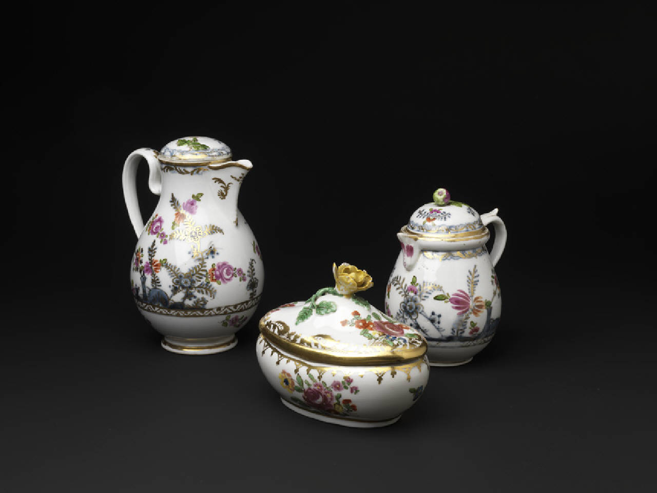 - NOTIZIE STORICO CRITICHE I tre pezzi (cioccolatiera, H 131; lattiera, H 132; zuccheriera, H 133), stilisticamente omogenei anche se non tutti provvisti di marca, compongono un servizio da té sono databili al terzo periodo della manifattura (1784-1864), quello della gestione di Sorgenthal, che segna una definitiva svolta verso il Neoclassicismo; la data trova conferma nella marca, costituita da uno scudo blu tripartito (I. De Palma 2011).