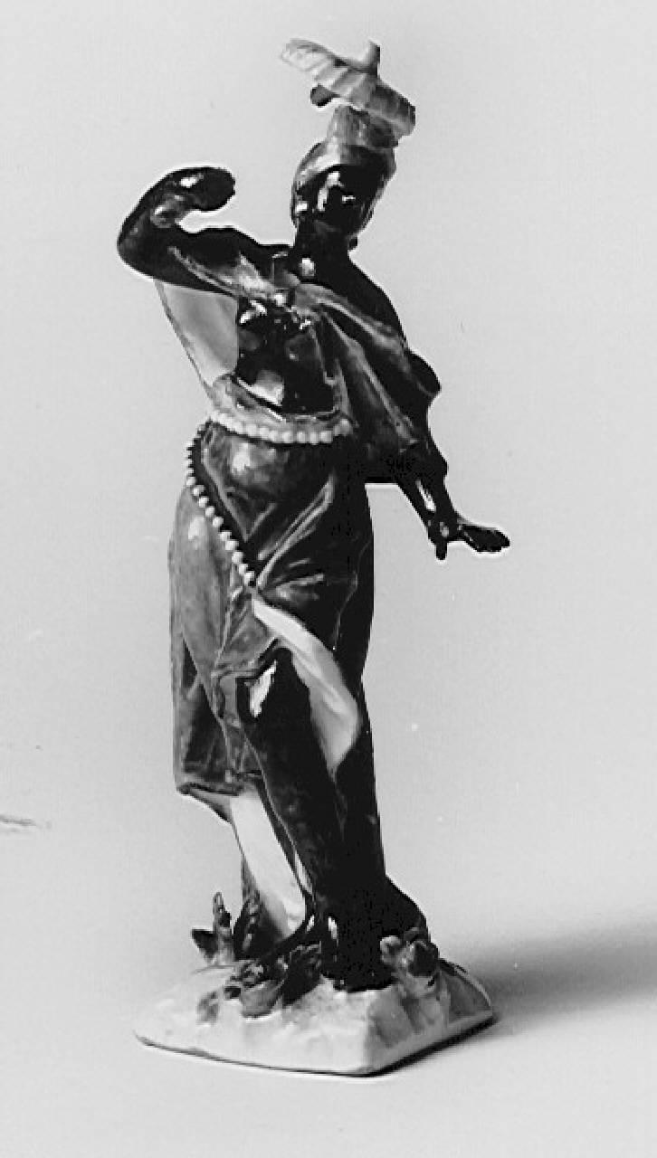 - NOTIZIE STORICO CRITICHE La statuetta è stilisticamente affine alle altre statuette della collezione Tadini marcate allo stesso modo e datate alla metà del Settecento (H1-H4) sebbene quella in esame non presenti la medesima qualità pittorica (il colore della veste inoltre, non è coeso con il supporto). Il modello è inseribile nella produzione della Manifattura di Meissen di statuette di gusto orientaleggiante intorno alla metà del XVIII secolo.\nIlaria De Palma