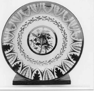 Piattino toncoconico con bordo a foglie e tondo centrale con tralci di vite