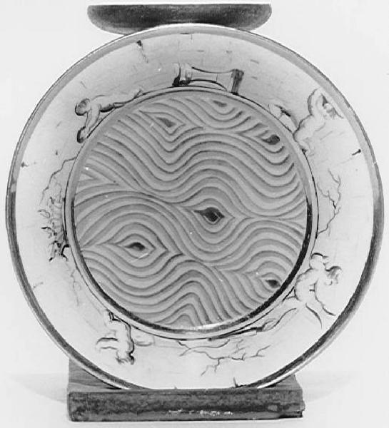 Piattino troncoconico dipinto di giallio con striature a finto legno sulla parte centrale e con putti in monocromo nella parte nella fascia lungo il bordo. Bordi oro