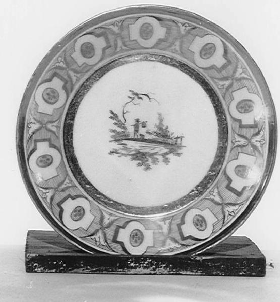 Piattino, ornato in oro sui bordi; al centro, viandante nel paesaggio