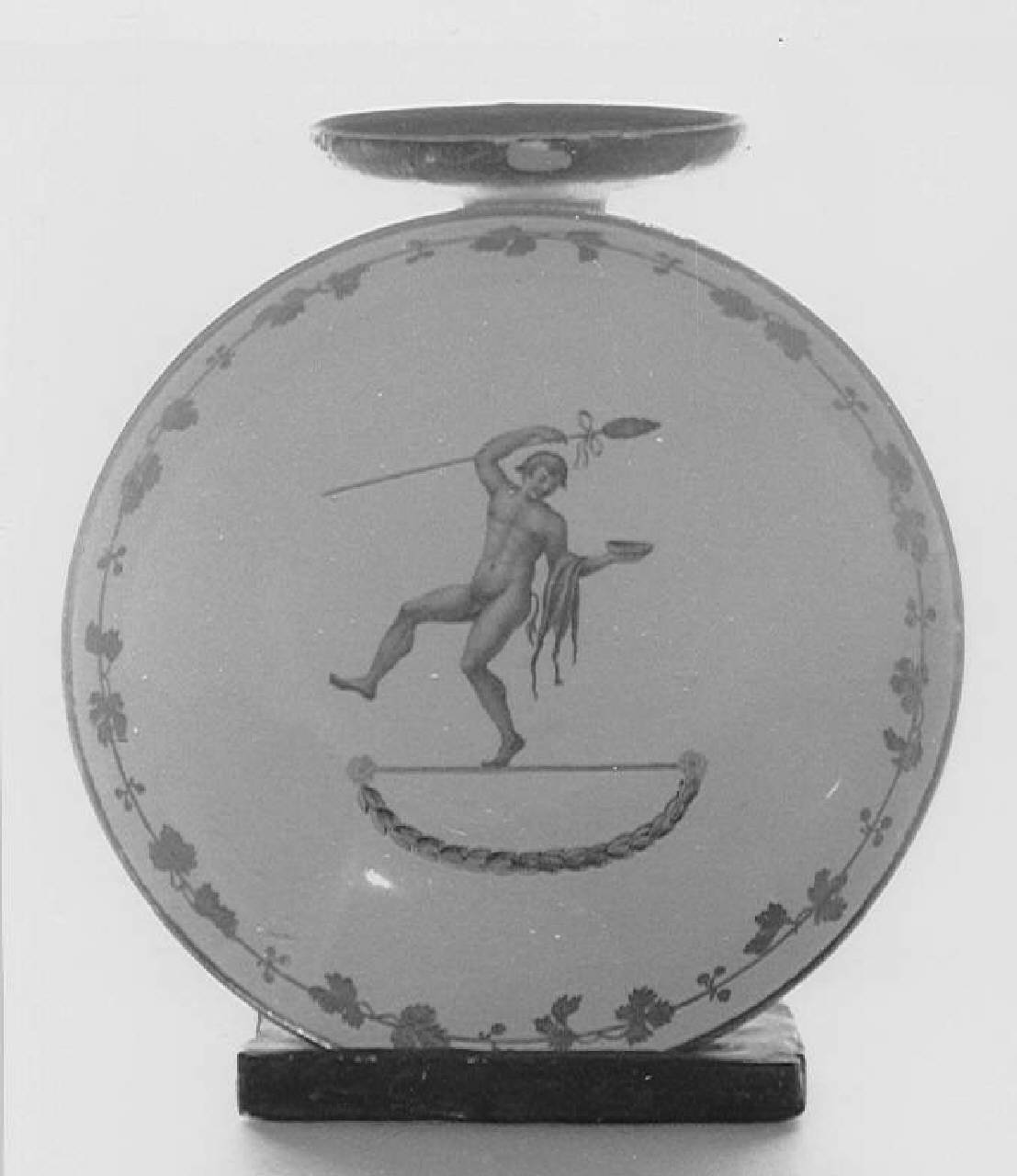 - NOTIZIE STORICO CRITICHE Le due tazzine documentano un decoro con figure di "acrobati", noti anche attraverso altri pezzi da un servizio da tè (tre tazze, la zuccheriera e quattro piattini) conservati a Milano, presso il Museo Teatrale alla Scala (Lise 1975, p. 244 n. 604). La circolazione dei motivi è documentata anche dalle incisioni del Voyage (1782). \nLa presenza della marca "RF", con riferimento alla Real Fabbrica Ferdinandea, consente di datare i pezzi al primo periodo della gestione di Domenico Venuti, che impresse alla produzione napoletana un raffinato gusto "all'antica": la serie si data infatti agli anni 1773-1787, con una preferenza per quest'ultimo termine (A. Mottola Molfino 1977, figg. 278-279 data i pezzi al 1785 ca.). Dal punto di vista tecnico, i quattro pezzi loveresi documentano quella fase della produzione della Real Fabbrica nell'ambito della quale l'uso di una particolare miscela di caolino e feldspati e un particolare gusto "all'antica" rendevano necessario il ricorso a una campitura di base in bianco, che costituiva una stesura perfettamente smaltata sulla quale il colore era steso a puntini, con raffinata tecnica da miniatore (A. Carola Perrotti, 1976).\nM. Albertario