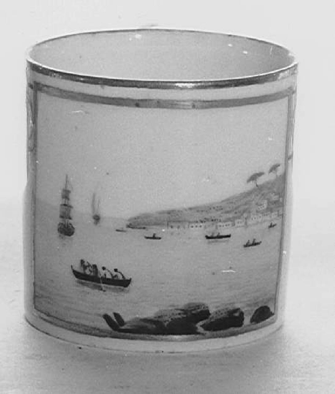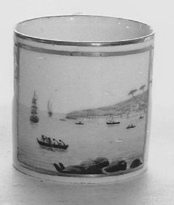 Tazzina di forma cilindrica con ansa. Bordo a semplice linea. Sulla tazzina, veduta marina.