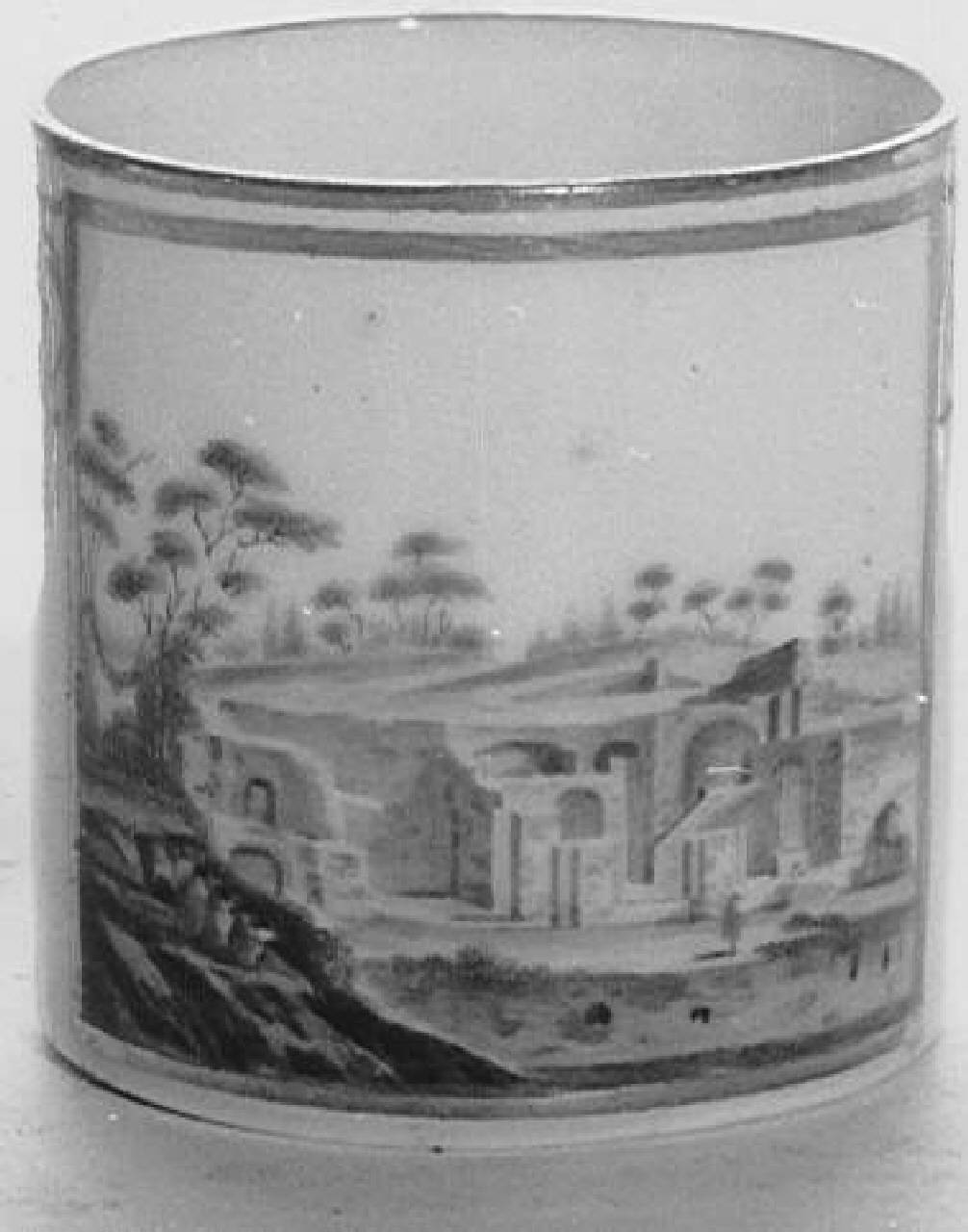 - NOTIZIE STORICO CRITICHE La marca "N" consente di riferire la tazza alla Reale Fabbrica di Porcellana di Napoli. La tazza presenta bordi a fili dorati e con un sottile fregio vegetale color rosso seppia. Tanto le dodici tazze cilindriche, quanto la zuccheriera presentano vedute del regno di Napoli, secondo un gusto ben noto all'interno della Manifattura, incorniciate da un sottile fregio vegetale color rosso seppia e da un bordino dorato. La tazza riporta una veduta delle rovine di Pompei viste dall'esterno (il punto di vista idealmente coincide con quello delle persone sedute a disegnare le rovine). La veduta interessa anche come fenomeno di costume, dal momento che l'accesso alla città e agli scavi era rigidamente controllato e non tutti i visitatori potevano visitarle.\nL'esecuzione delle vedute, basate su di una stesura a macchia che contrasta con la pennellata puntiforme di Giacomo Milani, celebre decoratore attivo in quell'arco di tempo, ha portato A. Pacia (2011), cui si deve la valorizzazione del servizio, a posticipare la datazione, fissata da A. Mottola Molfino (1977) intorno al 1780, al decennio successivo.\nMarco Albertario