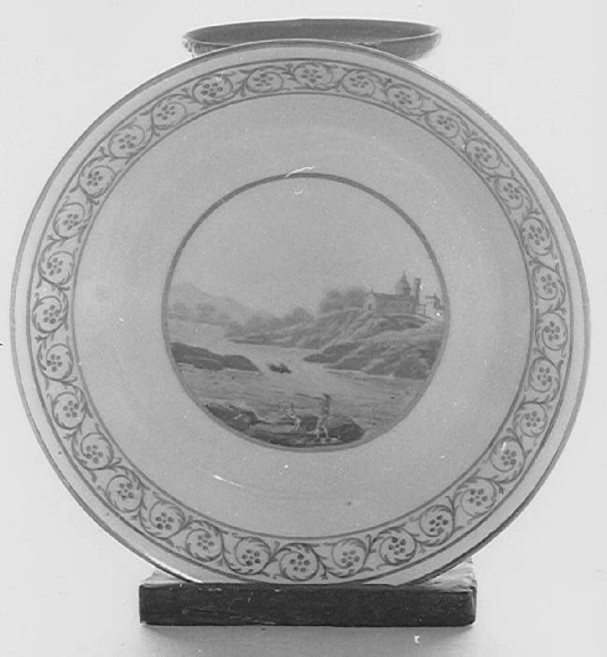Piattini troncoconici. Lungo il bordo sono dipinti veticci color rosso. Sul piattino, paesaggio con veduta costiera e edificio religioso.