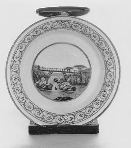 Piattini troncoconici. Lungo il bordo sono dipinti viticci color rosso. Sul piattino, paesaggio a colori con cascata tra rocce, ponte in legno.