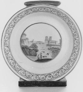 - NOTIZIE STORICO CRITICHE La marca "N" consente di riferire la tazza alla Reale Fabbrica di Porcellana di Napoli. La tazza presenta bordi a fili dorati e con un sottile fregio vegetale color rosso seppia. Tanto le dodici tazze cilindriche, quanto la zuccheriera presentano vedute del regno di Napoli, secondo un gusto ben noto all'interno della Manifattura, incorniciate da un sottile fregio vegetale color rosso seppia e da un bordino dorato. \nIl sito (oggi Isola del Liri, in provincia di Frosinone) con il castello che domina dall'alto la vista delle due cascate formate dai fiumi Fibrino e Liri e la piccola isola si presta ad una raffigurazione paesaggistica di gusto preromantico, fedelmente ripresa, come ha notato A. Pacia 2011, dalle tavole del Voyage pittoresque ou description de Royaumes de Naples et de Sicile di Saint-Non, 1781-1786.\nL'esecuzione delle vedute, basate su di una stesura a macchia che contrasta con la pennellata puntiforme di Giacomo Milani, celebre decoratore attivo in quell'arco di tempo, ha portato A. Pacia (2011), cui si deve la valorizzazione del servizio, a posticipare la datazione, fissata da A. Mottola Molfino (1977) intorno al 1780, al decennio successivo.\nMarco Albertario