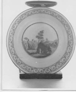 Piattini troncoconici. Lungo il bordo sono dipinti viticci color rosso. Sul piattino, paesaggio a colori con prato, rocce, edificio e figure