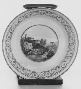 Piattini troncoconici. Lungo il bordo sono dipinti veticci color rosso. Sul piattino, paesaggio a colori con cascata, alberi, rocce, edificio e figure