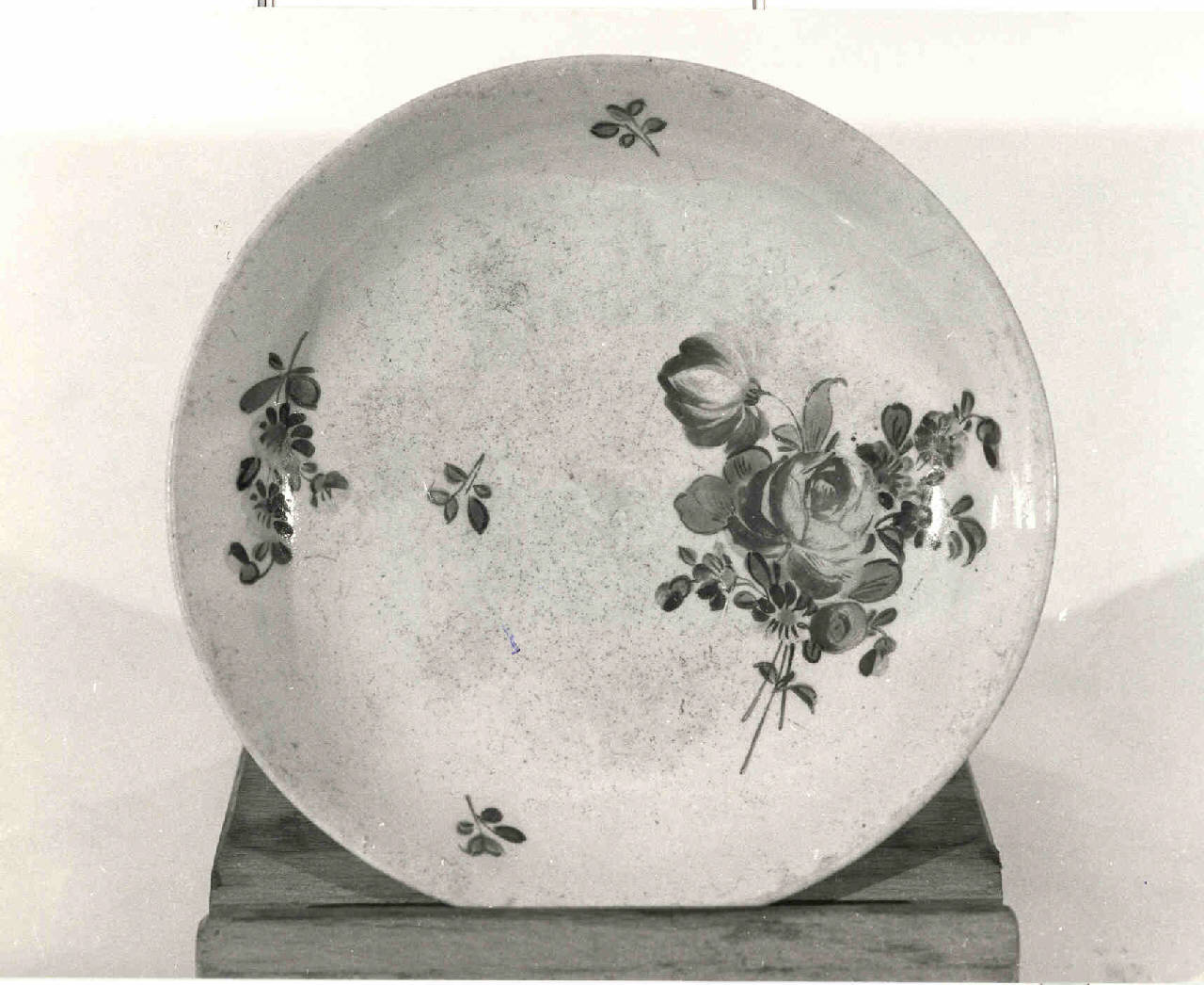 • NOTIZIE STORICO CRITICHE L'assenza di marca, il tipo di decorazione piuttosto comune, la pittura non particolarmente accurato dell'opera in esame non permettono di attribuirla con certezza ad alcuna manifattura.\nSebbene questo tipo di decorazione a fiori policromi su fondo bianco sia presente su numerosi pezzi costituenti il servizio da tavola di del Conte Tadini (Olivari 2011), per la forma del piatto in esame e per confronto con la qualità degli altri pezzi del servizio da tavola, non è possibile avvicinare l'opera a nessun esemplare della collezione.\nIlaria De Palma