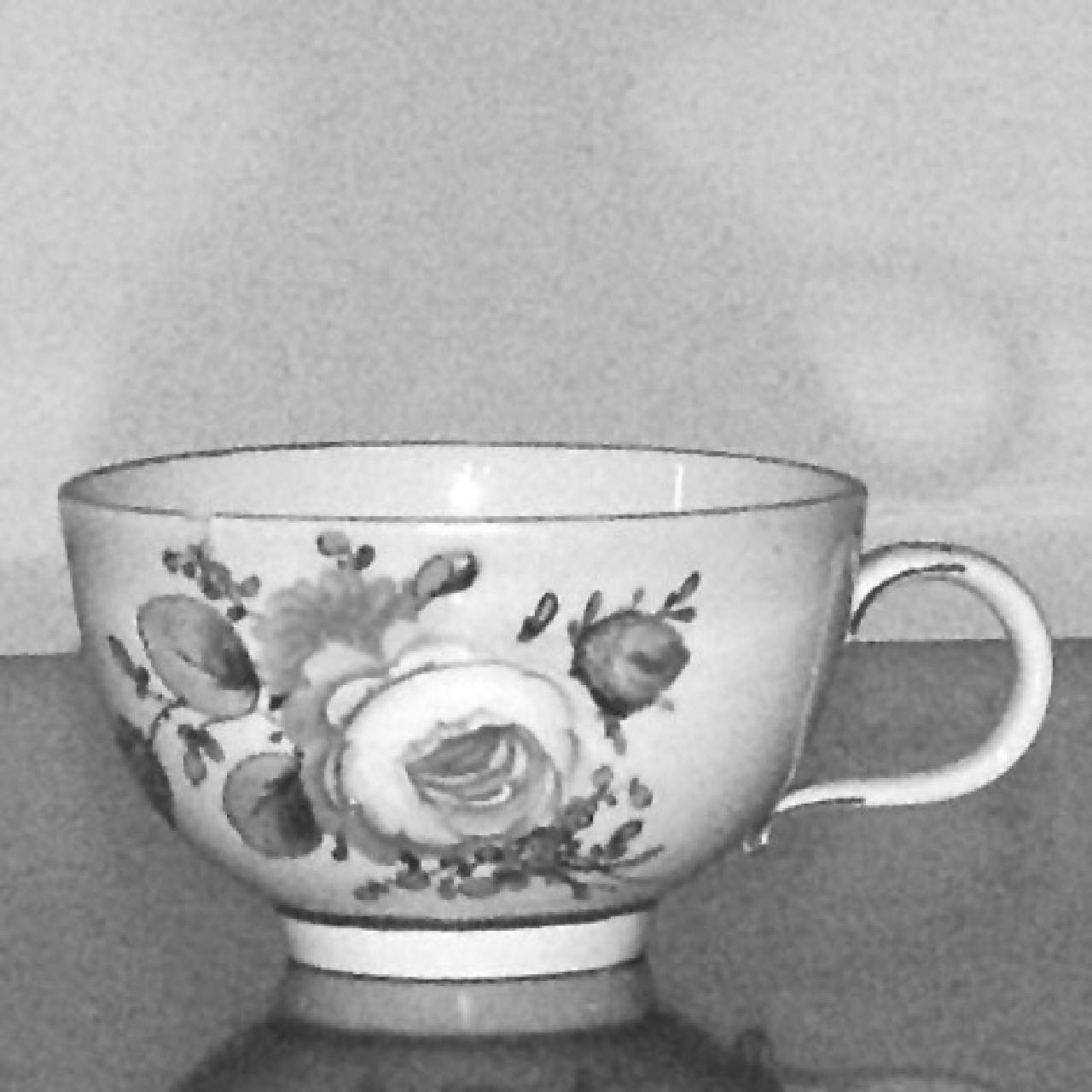 Tazzina a semicalotta con ansa. Labbro dorato ornato a mazzetti di fiori variopinti. Le tazzine recano dipinto un fiore sul fondo all'interno