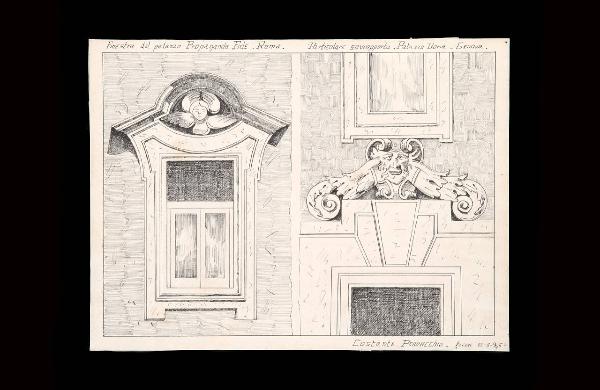 Finestra del palazzo Propaganda Fide Roma- Particolare sovrapporta palazzo Doria- Genova. Finestra e sovrapporta