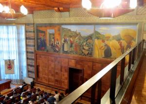 - NOTIZIE STORICO CRITICHE Usellini venne chiamato a lavorare a Sondrio dall'amico e collaboratore Giovanni Muzio, progettista del palazzo del Governo voluto dall'Amministrazione provinciale negli anni Trenta del Novecento. Per aderire alla realtà del paesaggio, della vita e dei costumi, così come richiesto esplicitamente dalla committenza, il pittore milanese realizzò una serie di schizzi corredati da note su usi, costumi e folclore locali, e si avvalse di scritti e della consulenza di esperti valtellinesi. I colori delle pietre, i luoghi e i costumi furono attentamente studiati da Usellini, che ritrasse se stesso nelle sembianze dello scalpellino di spalle nella scena con "La lavorazione del granito e l'alpinismo". La tecnica dell'encausto fu preferita al più consueto affresco perché garantiva maggiore durabilità, una gamma cromatica più vivace e una vantaggiosa indipendenza operativa per l'artista, che terminò i lavori nel 1934.