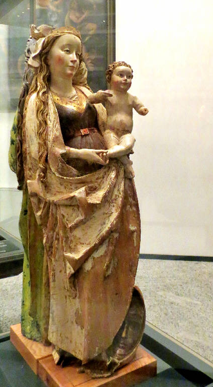 La figura della Vergine è scolpita in un unico tronco di tiglio, si presenta con lunghi capelli dorati sciolti sulla spalla destra, che sfuggono al velo chiaro trattenuto da una corona. Maria indossa un abito marrone damascato con scollo a V bordato d'oro, stretto in vita da una cintura rossa. Il lungo manto, molto rovinato e ormai privo della policromia, è trattenuto con la sinistra e cela la parte inferiore del corpo. Con la stessa mano è sostenuto il Bambino, frontale, seduto con le gambe incrociate, il piede sinistro stretto nella destra della madre. I visi sono dolci, paffuti, con rosette sulle guance. Ai piedi della Madonna è intagliata una falce di luna con volto umano coperto da un turbante, allusione contemporaneamente alla Donna dell'"Apocalisse" di Giovanni e al male da lei sconfitto.