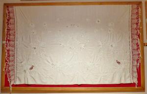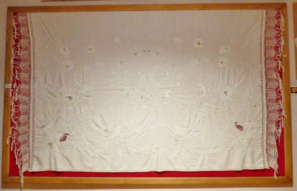 Grande tovaglia d'altare in stoffa di lino bianca, a forma rettangolare, con frange e pizzo ricamato sui lati corti. La tovaglia è ricamata a motivi floreali di ghirlande sulle quali si posano uccellini. Nell'ornamento a ricamo è presente la data di esecuzione.