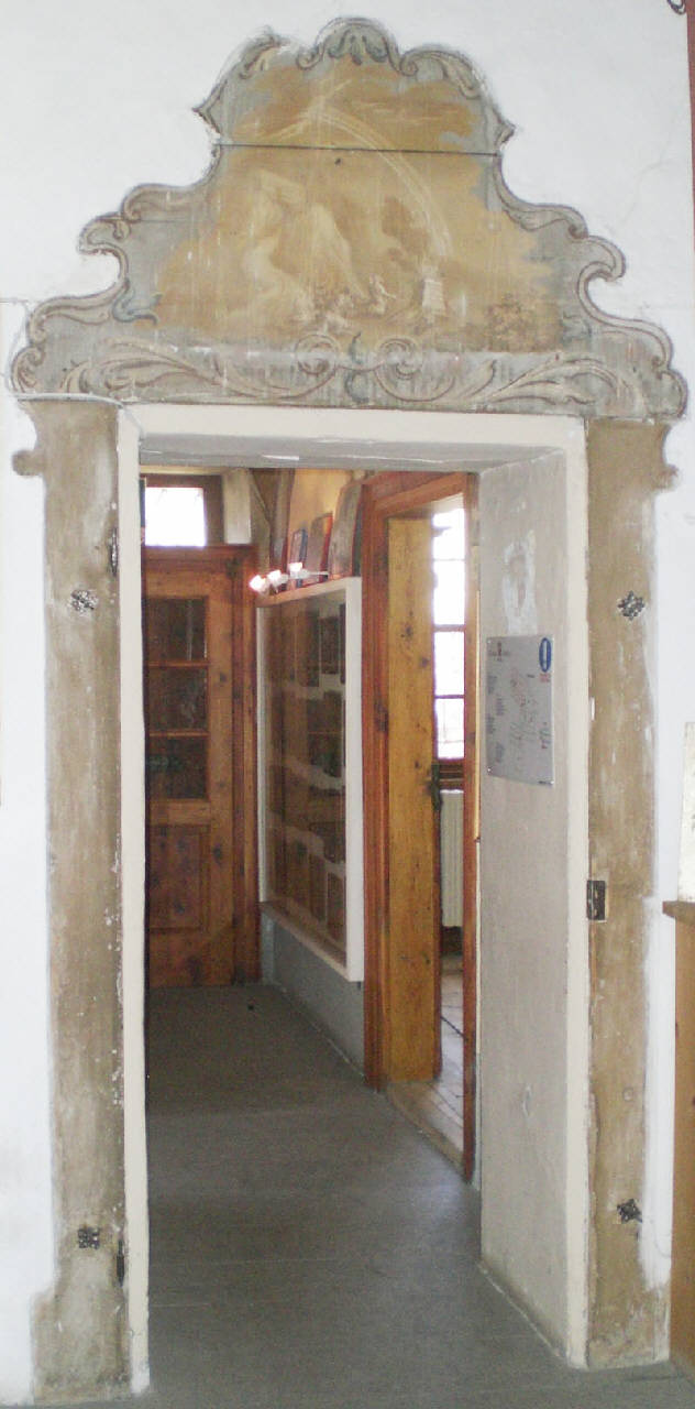 Sovrapporta con perimetro mistilineo simile a cartoccio, impostata su stipite di porta. Coloritura perimetrale grigia, elementi decorativi di volute floreali e figurazione centrale in monocromo ocra (l'arca di noè poggia su di un monte, a fondo valle vi sono delle persone prostrate in segno di ringraziamento, davanti ad un'ara, vi è un arcobaleno). Quattro elementi in ferro a volute infissi negli stipiti. Manca il battente della porta ma restano i due cardini in ferro.\n.