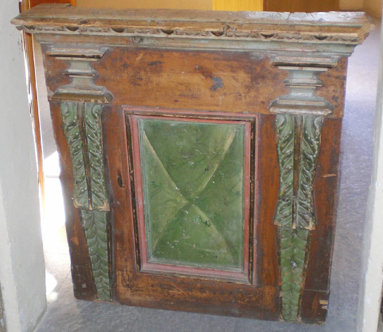 Inginocchiatoio di legno intagliato e dipinto, con fronte scandita da due lesene con decorazione fogliacee dipinte di verde, a reggere una cornice modanata. Al centro il pannello è decorato con una specchiatura verde con cornice modanata rossastra e nera. Sul retro è presente un gradino per inginocchiarsi.