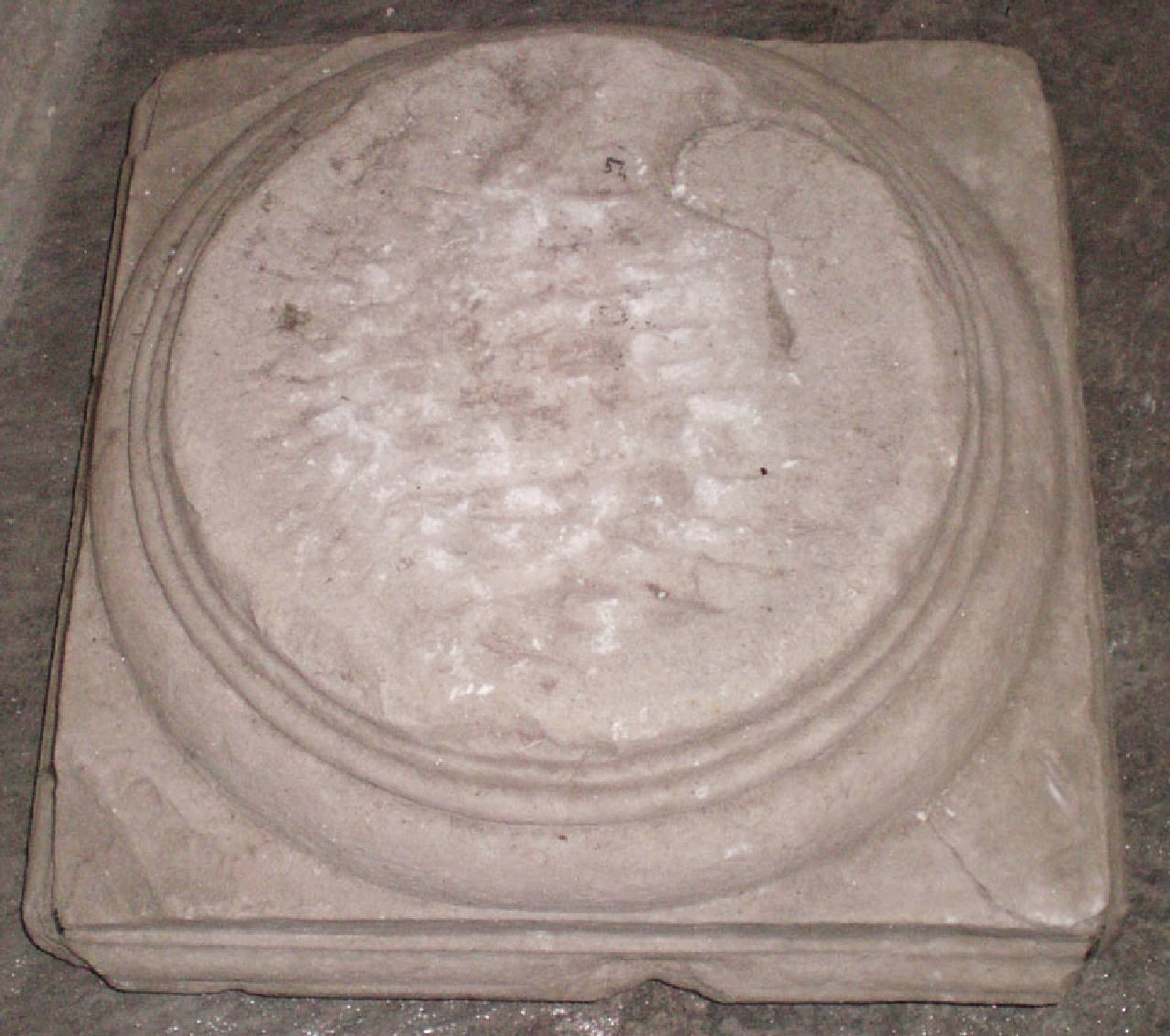 Base di colonna in pietra chiara, costituita da un basamento quadrato e da un innesto circolare con toro schiacciato e modanature più piccole, sul quale appoggiava la colonna.