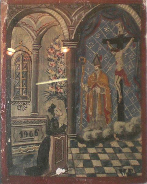 Tavoletta rettangolare di legno dipinta; finta cornice rossa dipinta.\nL'ex voto raffigura una scena di interno. Un'arcata divide in due parti la scena: a sinistra un scerdote indossa cotta e cappello nero, con una fascia bianca in vita, sta inginocchiato entro un ambiente architettonico definito da colonne e finestre ad arco. Quello che potrebbe essere la mensa di un altare riporta la data 1906. La parte sinistra vede, sempre dentro arcata addobbata con drappi neri a frange rosso cupo, il Cristo crocefisso affiancato da un vescovo con piviale dorato con risvolti rossi, mitria e pastorale. Delle nuvole bianche dividono la scena da un pavimento a scacchiera bianca e nera.