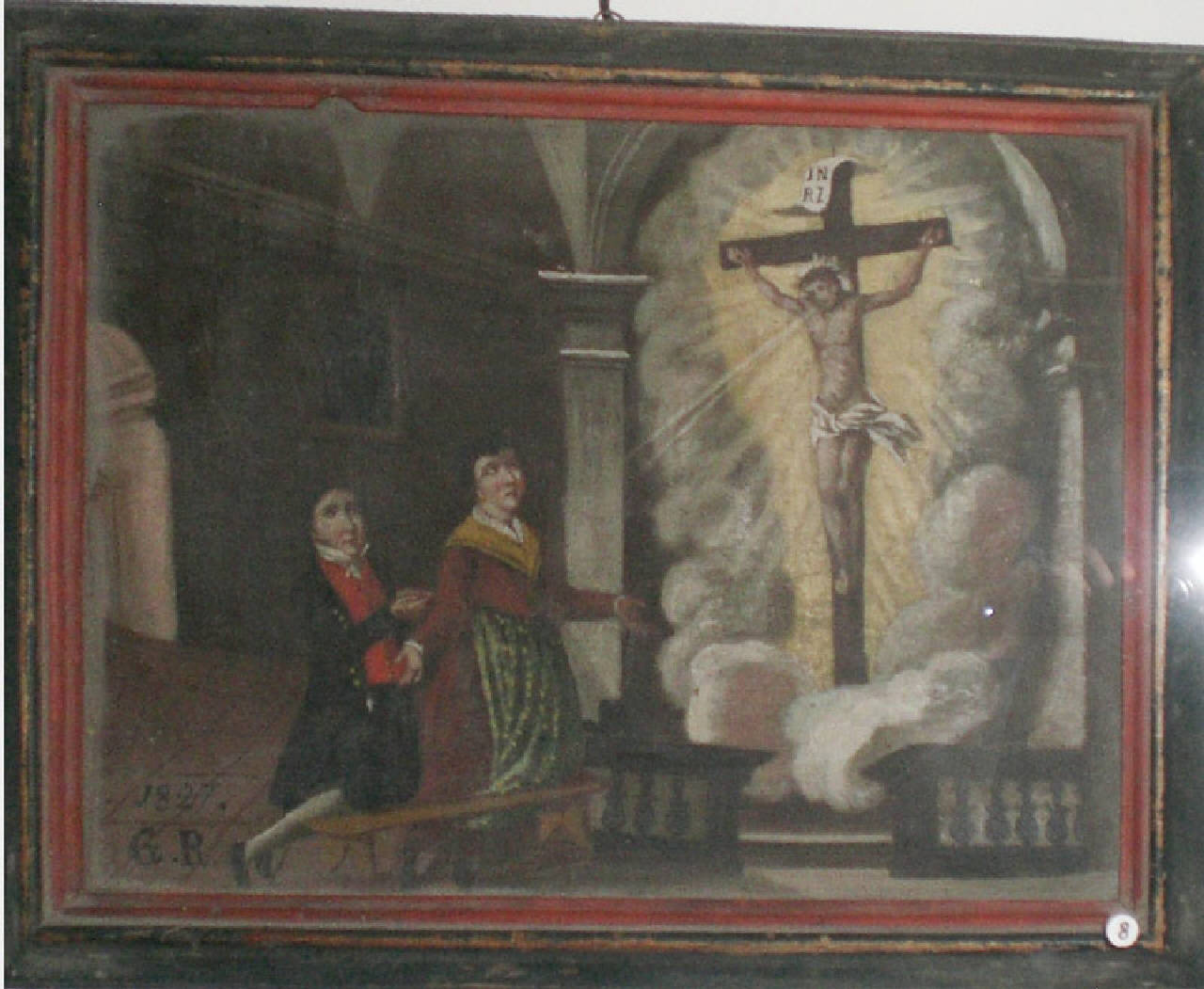 Dipinto su tela rettangolare, con cornice nera e rossa modanata.\nL'ex voto raffigura una scena di interno, in una chiesa: a destra il Crocefisso tra nuvole bianche e raggi di luce gialla, posto in una cappelletta con colonne laterali, arco e balaustre; A sinistra in basso, inginocchiati su una panca, un uomo, vestito di nero, con calze bianche, panciotto rosso, camicia bianca a collo alto, ed una donna con vestito marrone chiaro, grembiule verde a puntini bianchi, fazzoletto giallo con orlo nero. Sul fondo la navata di una chiesa. In basso a sinistra, la data 1827 e le lettere: G.R