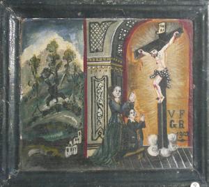 Tavoletta rettangolare di legno dipinta; cornice nera in legno modanata.\nEx voto raffigurante a destra, in una nicchia illuminata da luce giallastra, il Crocefisso con alcune nuvolette bianche ai piedi della Croce; al centro, davanti all'esterno della nicchia riccamente decorata, una donna con vestito verde e giacca nera orlati di ricami gialli, ed un bambino vestito di nero con fazzoletto bianco al collo, inginocchiati in preghiera. A destra un paesaggio con case, piante e montagne. Tra le piante si intravede una persona vestita di nero mentre sta cadendo, a capo all'ingiù, da un albero. Ai piedi della Croce, le lettre in nero: V.F.G.R. e la data: 1902