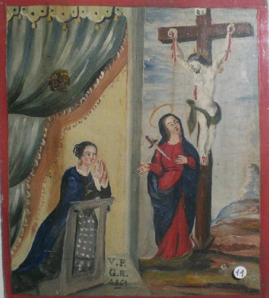 Tavoletta rettangolare di legno dipinta; finta cornice rossa dipinta.\nEx voto raffigurante a sinsitra, su un inginocchiatoio, una donna vestita di nero e blu con gonna a puntini bianchi, con le mani giunte; dietro di lei un drappo argeneteo con frange dorate. A destra, il Crocefisso, piantato in terra ed affinacato dalla figura della Vergine Addolorata vestita di rosso con manto azzurro e con una spada conficcata nel petto. Sullo sfondo, una motagna e cielo biancastro. Al centro, in basso, la scritta: VFGR 1861.