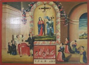 Tavoletta rettangolare di legno dipinta; finta cornice rossa dipinta.\nEx voto raffigurante una nicchia centrale, ornata da ghirlande di fiori rossi e blu e cornice marezzata. Vi si trovano Il Crocefisso, la Madonna e sant' Antonio abate; sotto di questi vi sono le anime purganti tra fiamme. A destra vi sono quattro donne inginocchiate con le mani giunte. Da un'arcata laterale si intravede un paesaggio alpino con montagne, case ed alberi. A sinistra si trova una persona a letto con un braccio rivolto verso il Crocefisso. Alla sua detra due ragazzi inginocchiati, alla sua sinistra un unomo in piedi che indica la persona malata. In basso al centro compare la scritta : VFGR 1864.