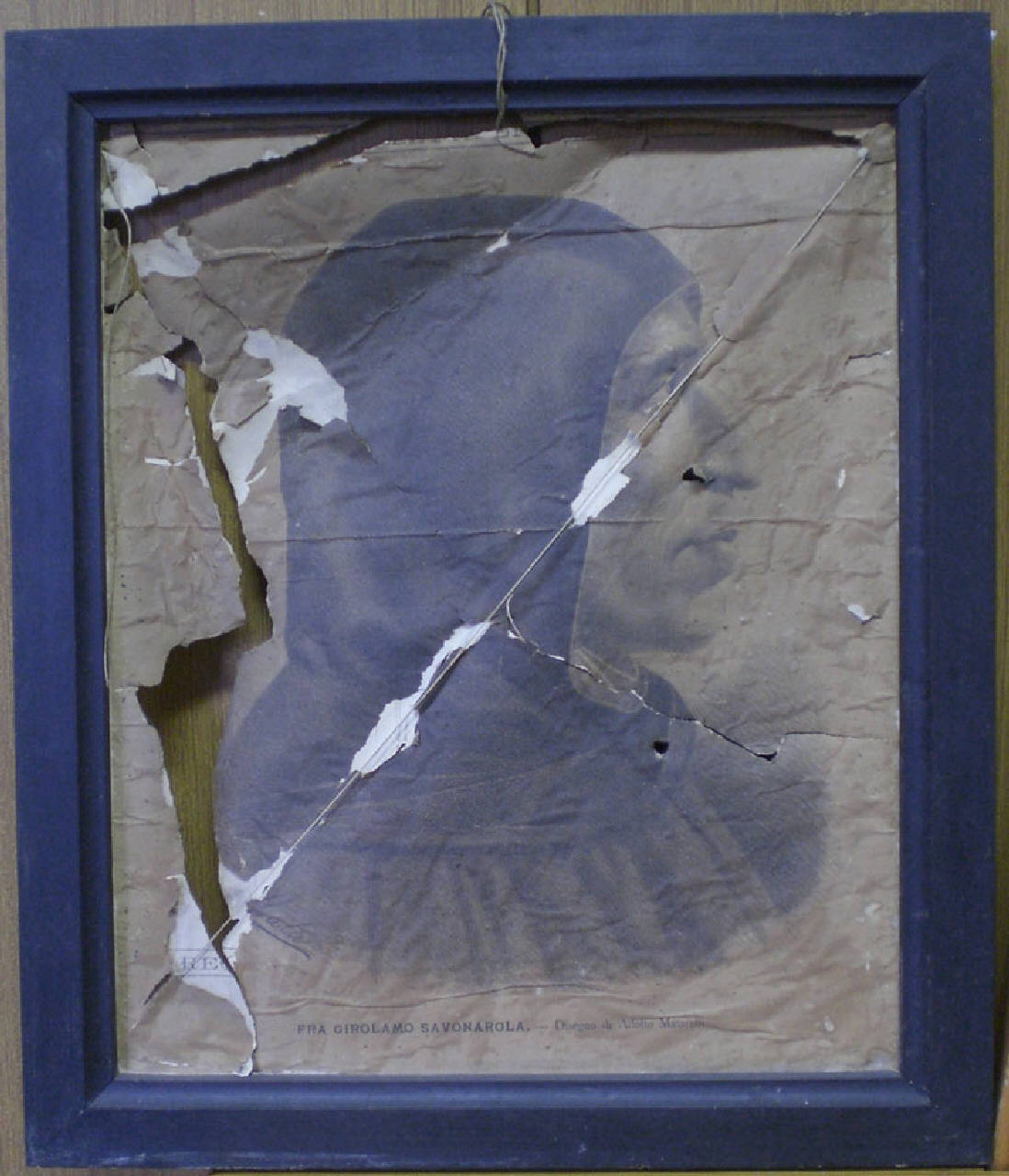 Litografia su carta di formato retangolare, incollata su un secondo supporto cartaceo e spago. Inserita in cornice di legno sagomata e dipinta di nero.
