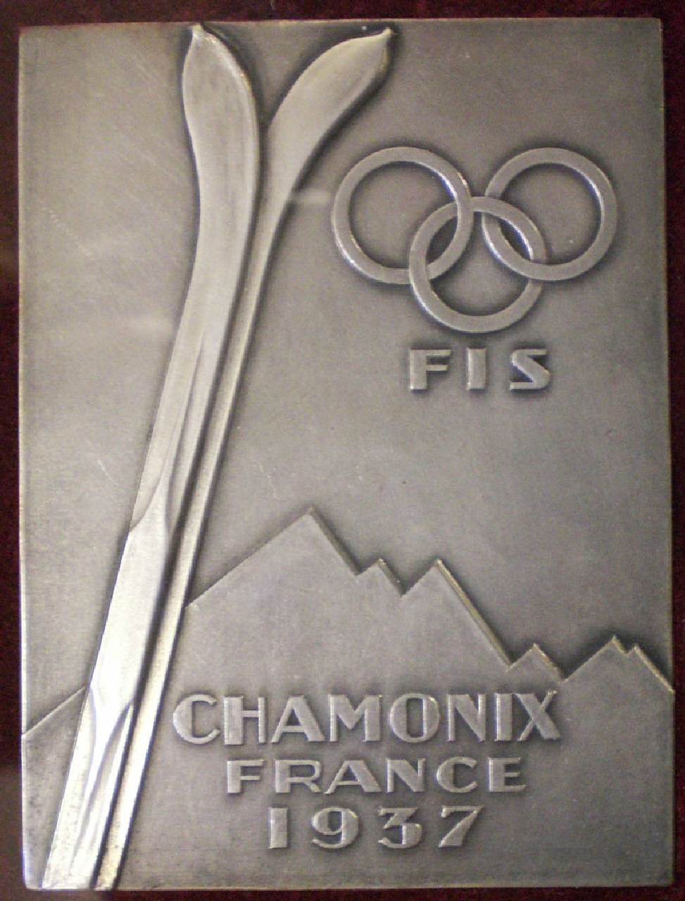 Medaglia sportiva, rettangolare, in argento con figurazione e iscrizione relativa ai Campionati del Mondo di Sci di Chamonix del 1937.