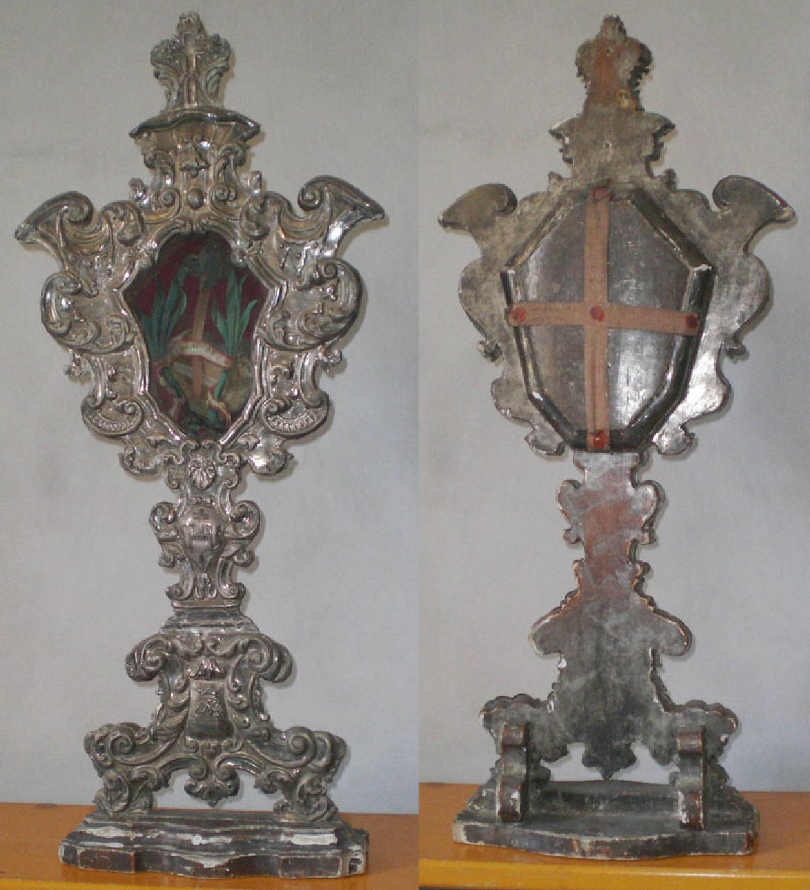 Reliquiario a ostensorio, in legno intagliato, dipinto e con applicazione di lamina d'argento. Fusto sagomato con piede a voluta. Ricettacolo sagomato con volute e cartocci. Teca mistilinea rivestita di stoffa, contenente reliquie ossee accompagnate da palmette e scritte di carta; chiusa da vetro. Sul retro la teca è chiusa da due strisce di stoffa incrociate, con 5 sigilli rossi in cera posti alle estremità e all'incrocio delle fettucce.