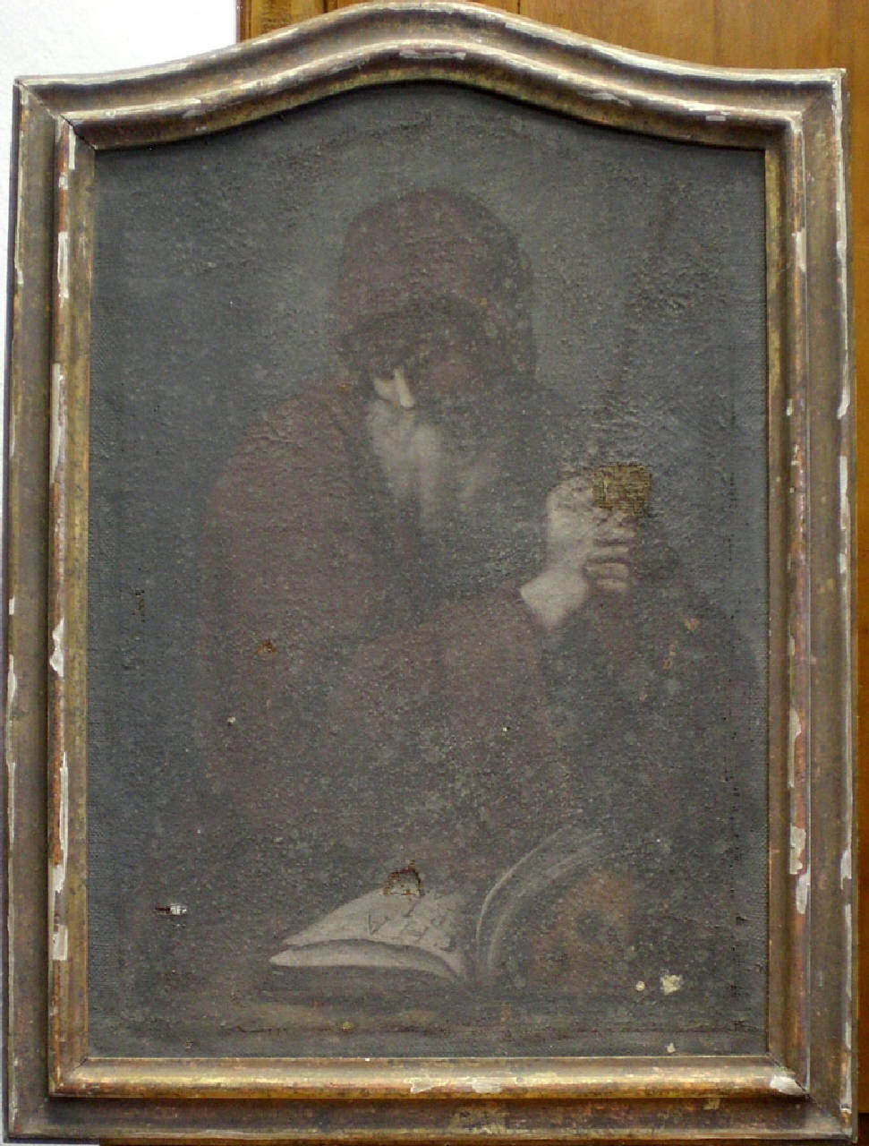 Oggetto rettangolare con lato superiore curvo. Dipinto su tela, incorniciato con cornice modanata e dorata.
