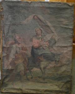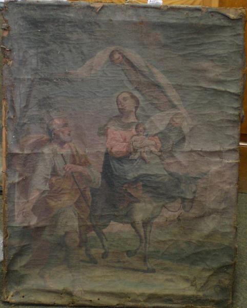 Dipinto a olio su tela, di forma rettangolare, senza cornice. La lettura dell'immagine è resa difficile dal cattivo stato di conservazione.