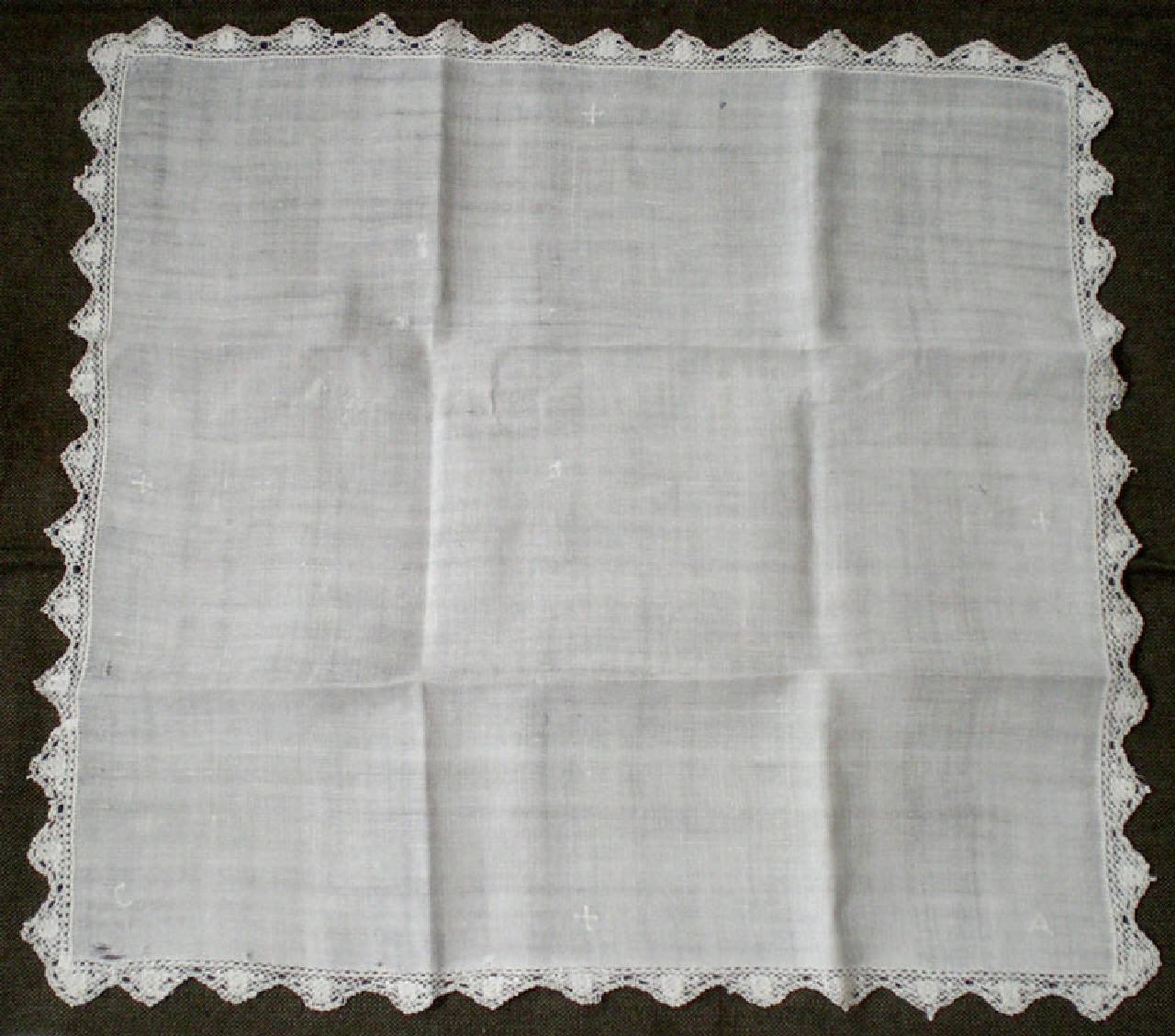 Corporale in cotone bianco con 4 piccole croci a bracci uguali ricamate a metà dei quattro lati. Bordo decorato con merletto. In due angoli compaiono le iniziali C e A.