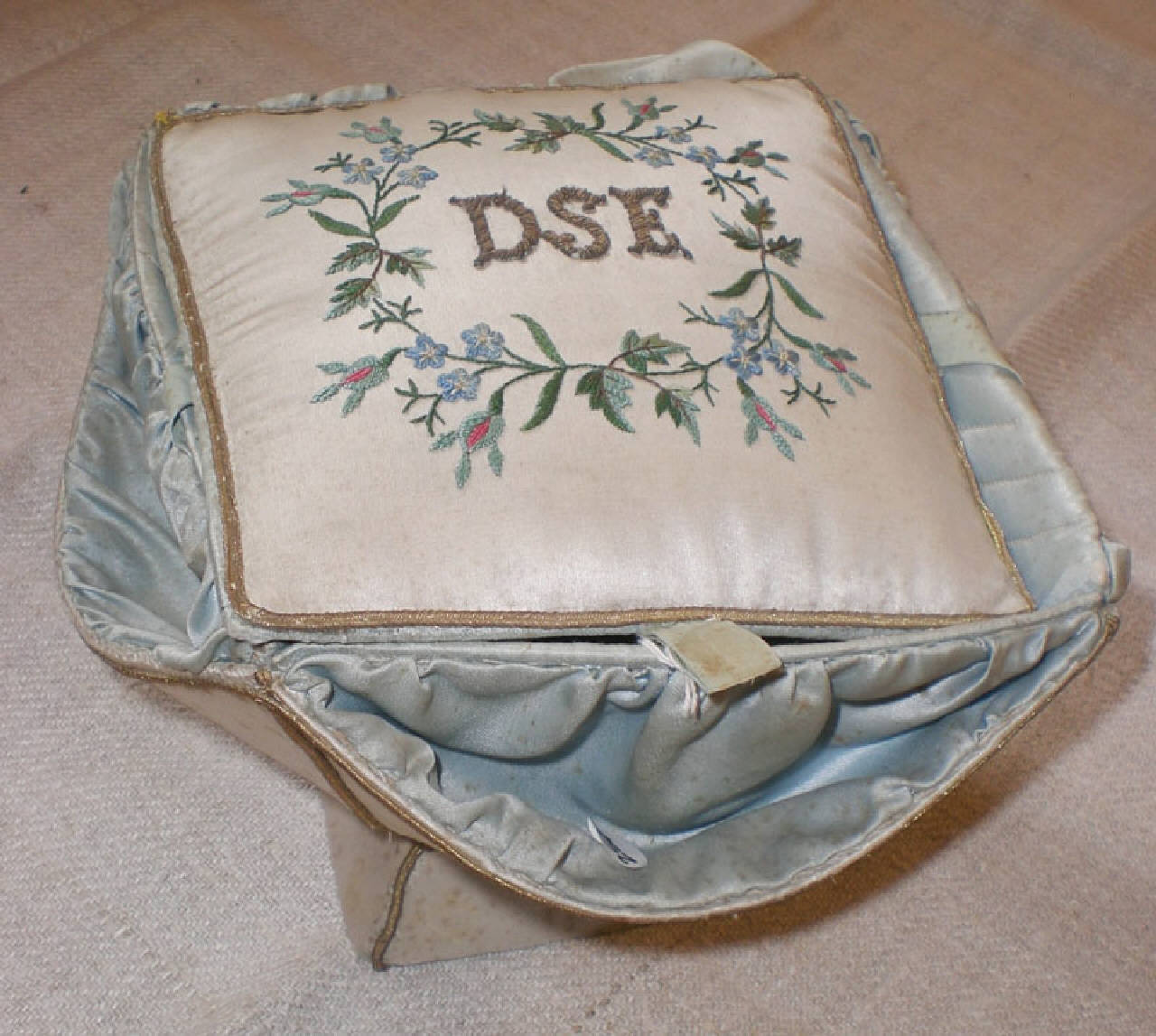 Cofanetto di seta ricamata bianca e celeste, a forma di tronco di piramide rovesciata poggiante su una base pure a tronco di piramide. \nE' provvisto di coperchio sempre in seta, dove sono ricamate al centro le lettere DSE e attorno sono realizzate, sempre a ricamo, foglie e fiori azzurri e bocciuoli di rosa rossi; il coperchio è cucito in un lato.