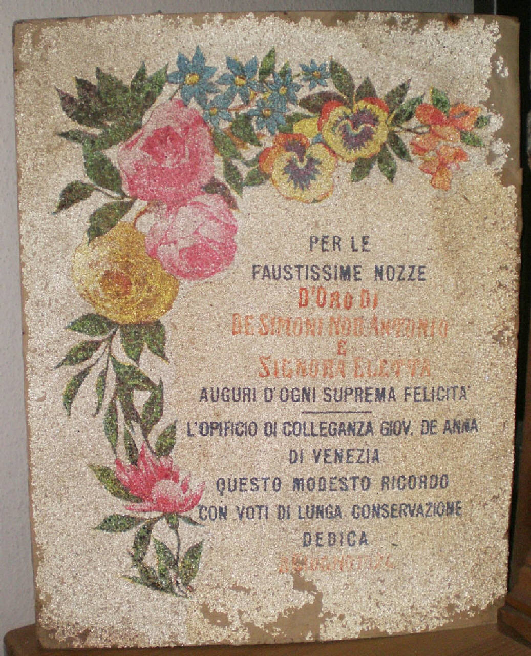 Su di un cartoncino rigido con fondo bianco compare una scritta in lettere capitali nere e rosse, circondata in alto e a sinistra da fiori colorati. Tale disegno e scritta sono ricoperti da un particolare materiale plastico a granaglia.