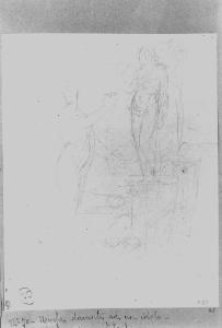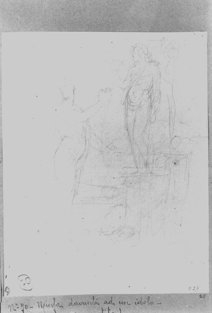 - NOTIZIE STORICO CRITICHE Il disegno presenta uno studio per un soggetto mitologico-allegorico di non facile interpretazione: una figura femminile, forse una ninfa, in atto di porgere una ghirlanda ad un idolo. Lo stile, veloce e fluente, e il tema, possono collocare il disegno agli inizi del XIX secolo. Il disegno faceva parte della collezione privata di Giuseppe Vallardi che, intorno al 1820 ordinò in album ben 344 disegni di Appiani. L'album, di formato atlantico, pervenne all'Accademia di Brera nel 1875 per donazione di E. Cernuschi, allora residenta a Parigi, dove lo acquistò nel 1856-1860 (periodo in cui a Parigi si tennero aste di vendita di opere di provenienza Vallardi).