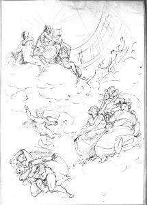 - NOTIZIE STORICO CRITICHE Molto probabilmente il disegno è un primo studio per l'affresco, poi non realizzato, rappresentante il "Trionfo di Giove sui giganti in Flegrea", di cui esiste un disegno con l'idea definitiva. Il progetto venne approvato il 23/01/1804 da una commissione formata da G. Traballes, V. Monti e G. Bossi e doveva decorare la medaglia centrale della Sala delle Cariatidi di Palazzo Reale per celebrare la Campagna di Russia, ma dato l'esito disastroso, non fu realizzata. Il disegno faceva parte della collezione privata di Giuseppe Vallardi che, intorno al 1820 ordinò in album ben 344 disegni di Appiani. L'album, di formato atlantico, pervenne all'Accademia di Brera nel 1875 per donazione di E. Cernuschi, allora residenta a Parigi, dove lo acquistò nel 1856-1860 (periodo in cui a Parigi si tennero aste di vendita di opere di provenienza Vallardi).\n\nVerificare.\nAl verso studio per figura femminile nuda seduta e studio per compartimento decorativo.