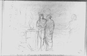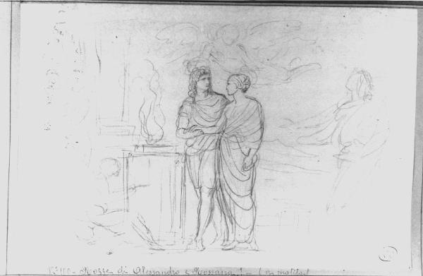 - NOTIZIE STORICO CRITICHE Il disegno presenta lo studio per una rappresentazione di rito nuziale, svolto secondo i canoni dell'estetica neoclassica attraverso una raffigurazione allegorica. Il rito si svolge all'uso antico, presso un'ara a cui si accostano i due sposi paludati. Un genio alato li incorona. Un altro genio alato (la Storia?) iscrive l'evento sull'ara, a perenne memoria. Si tratta di uno studio per opera su commissione privata, di cui non si hanno dati. Esiste un disegno molto più accurato (ubicazione ignota) dello stesso soggetto indicato come composizione allegorica per le nozze di Beatrice Cusani e G.B. Litta Modignani.\n\nAl verso studio delle due figure centrali della composizione sul recto, studio di mani giunte.